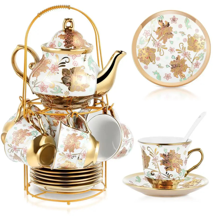 20 Pcs Porcelain Tea Set with Metal Holder and Spoon Adult Ceramic Tea Set European Flower Painting Teapot Cup Saucer