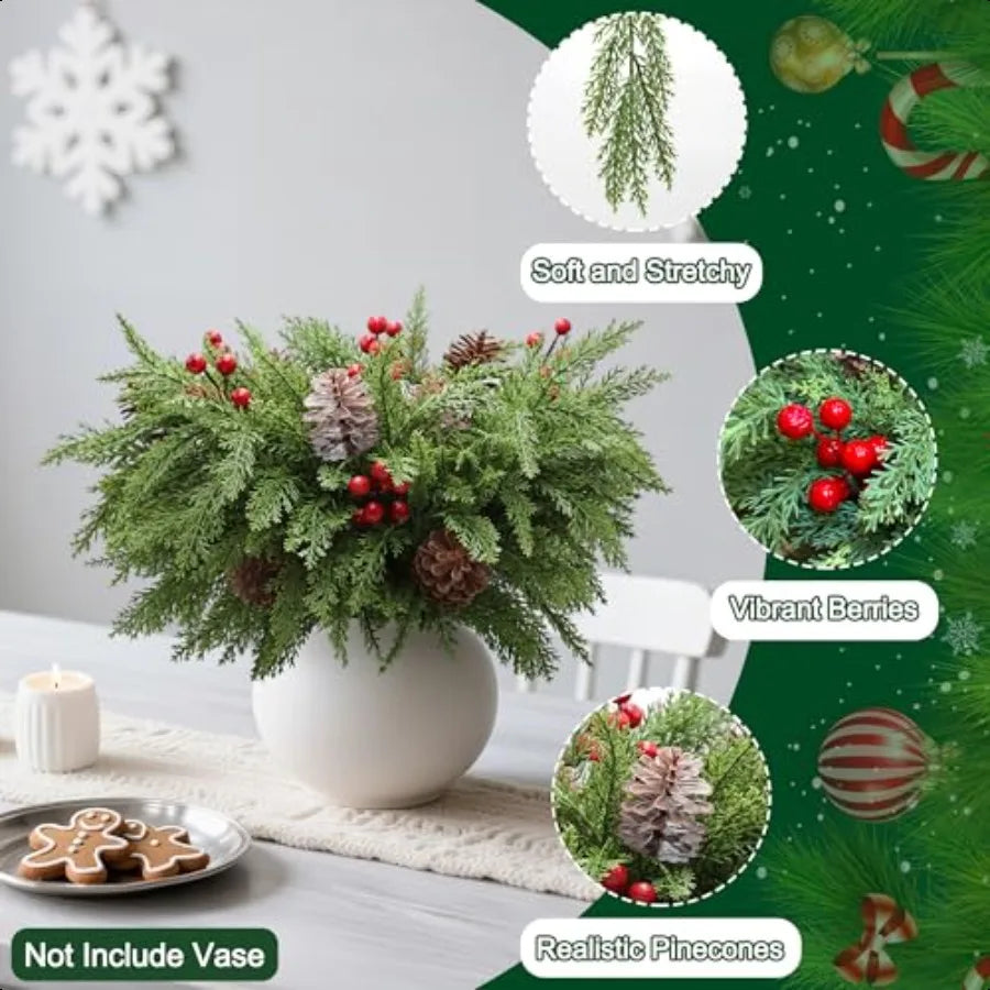 24PCS Christmas Pine Branches Decorations Artificial Pine Branches with Red Berry Stems and Pinecones for Christmas Decorations