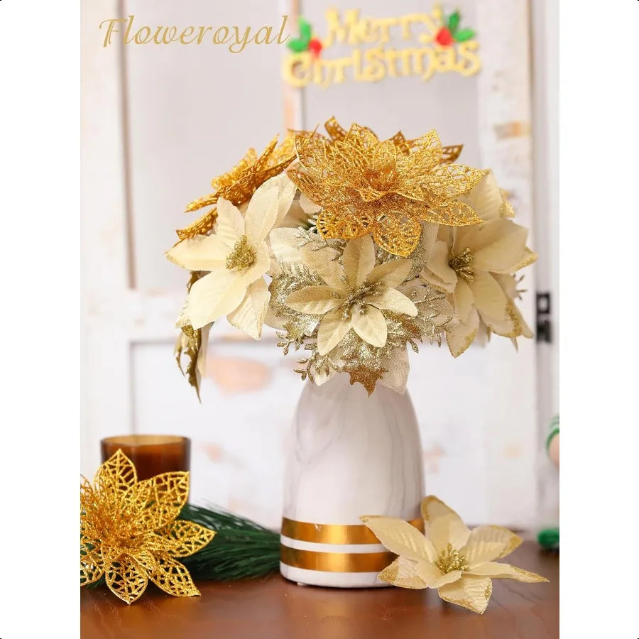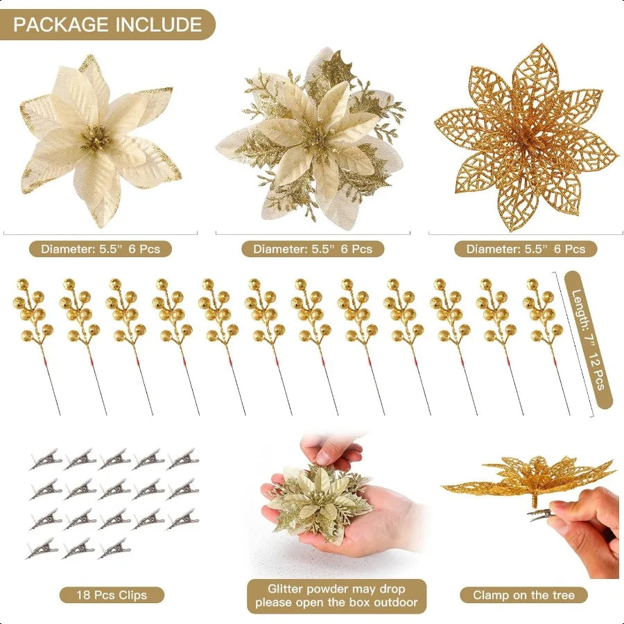 30pcs Poinsettia Artificial Christmas Flowers Decorations with Clips and Berry Stems Glitter Ornaments for Christmas Tree Wreat