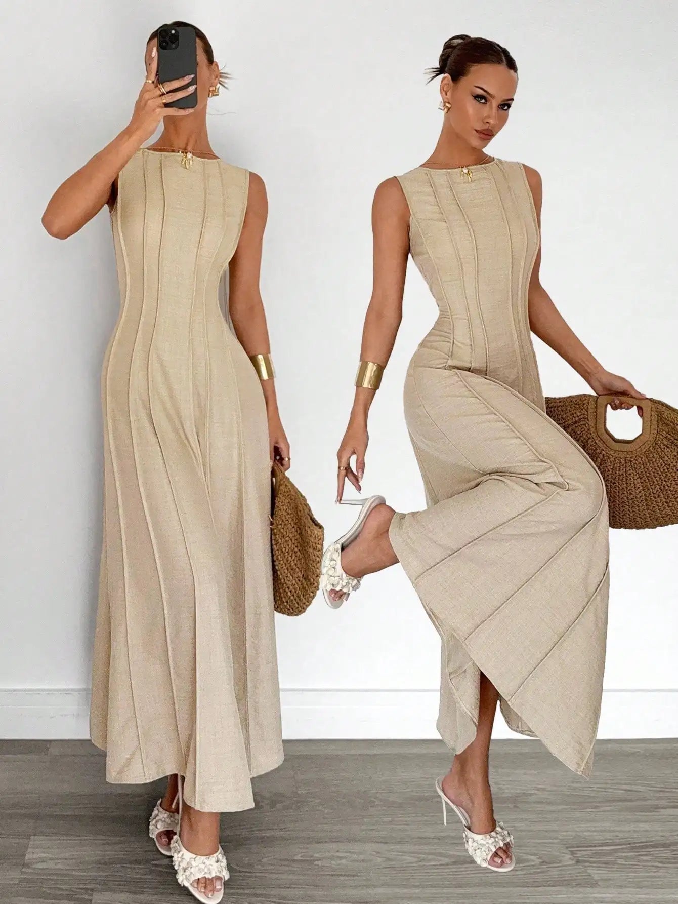 Elegant Linen Long Dress for Women, A-Line Pleated Waist, Sleeveless Maxi with Side Slit, Summer Holiday & Party Wear