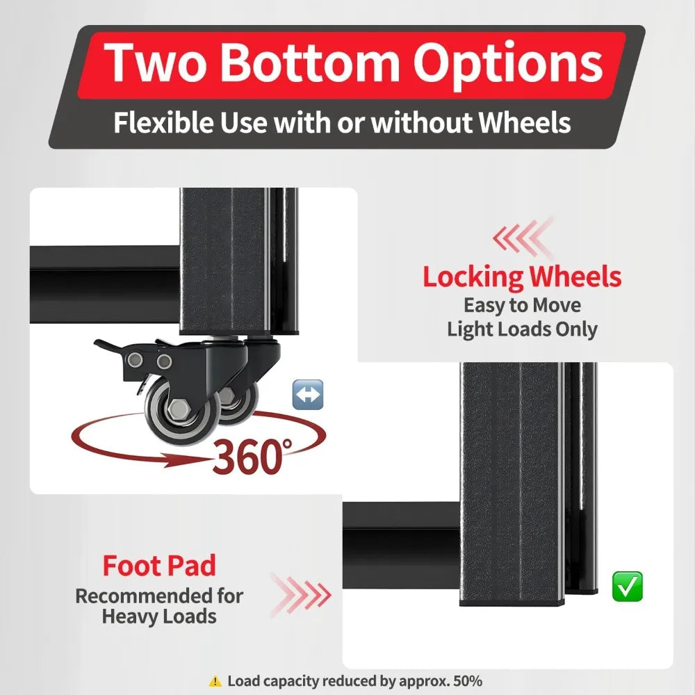 This shelving unit is designed with heavy-duty construction, featuring double-walled columns that can support up to 400 pounds per shelf, with a total capacity of 2000 pounds. It measures 47.2 inches in width, 23.6 inches in depth, and 72 inches in height, making it ideal for storing tools, items, or holiday decorations. The unit comes with detachable wheels for added portability, but it's important to note that using the wheels reduces the weight capacity by 50% to 1000 pounds. For optimal load capacity, it's recommended to use the unit without wheels. The shelves are adjustable, allowing you to customize the storage space for items of varying sizes. The included pegboard offers additional hanging options for tools or accessories, promoting a more organized and efficient workspace. Assembly is straightforward, requiring no special tools and clear instructions, enabling you to have your shelves ready for use in a short amount of time. This storage solution is versatile and suitable for various environments, including garages, workshops, warehouses, kitchens, and home offices, making it perfect for anyone in need of a strong, adjustable, and adaptable storage system.