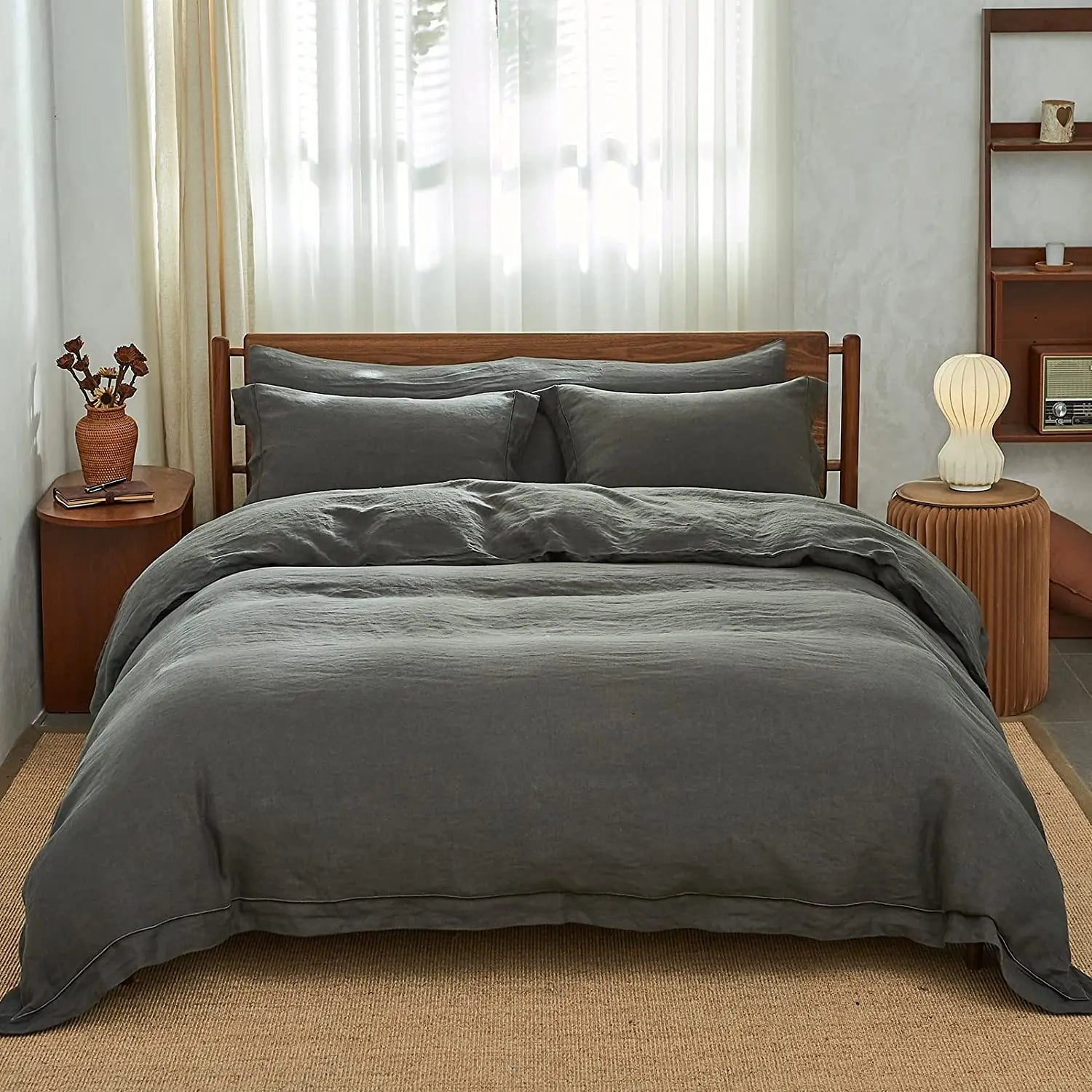 Simple&Opulent 100% Linen Bedding Set 3Pcs Washed Comforter Boho Breathable Queen King Size Duvet Cover Bed Sheet Pillow Shams