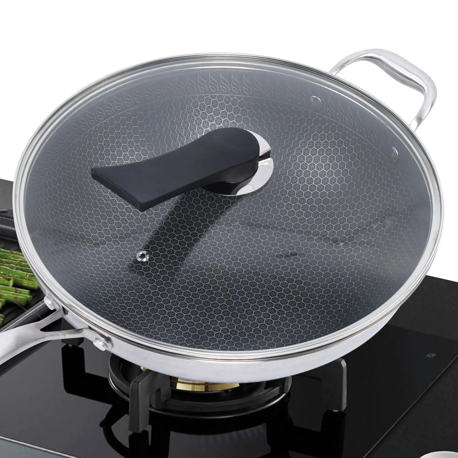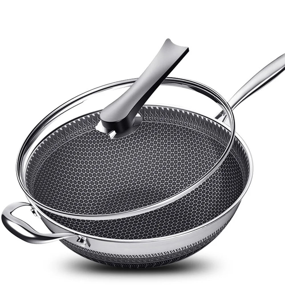 Stainless Steel Non Stick Double Sided Screen Honeycomb Wok Frying Pan Kitchen Chinese Cast Cooking Fry Pan 34cm