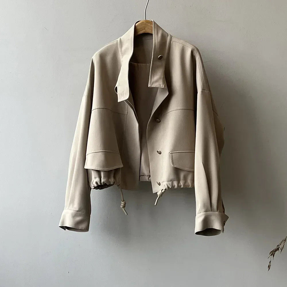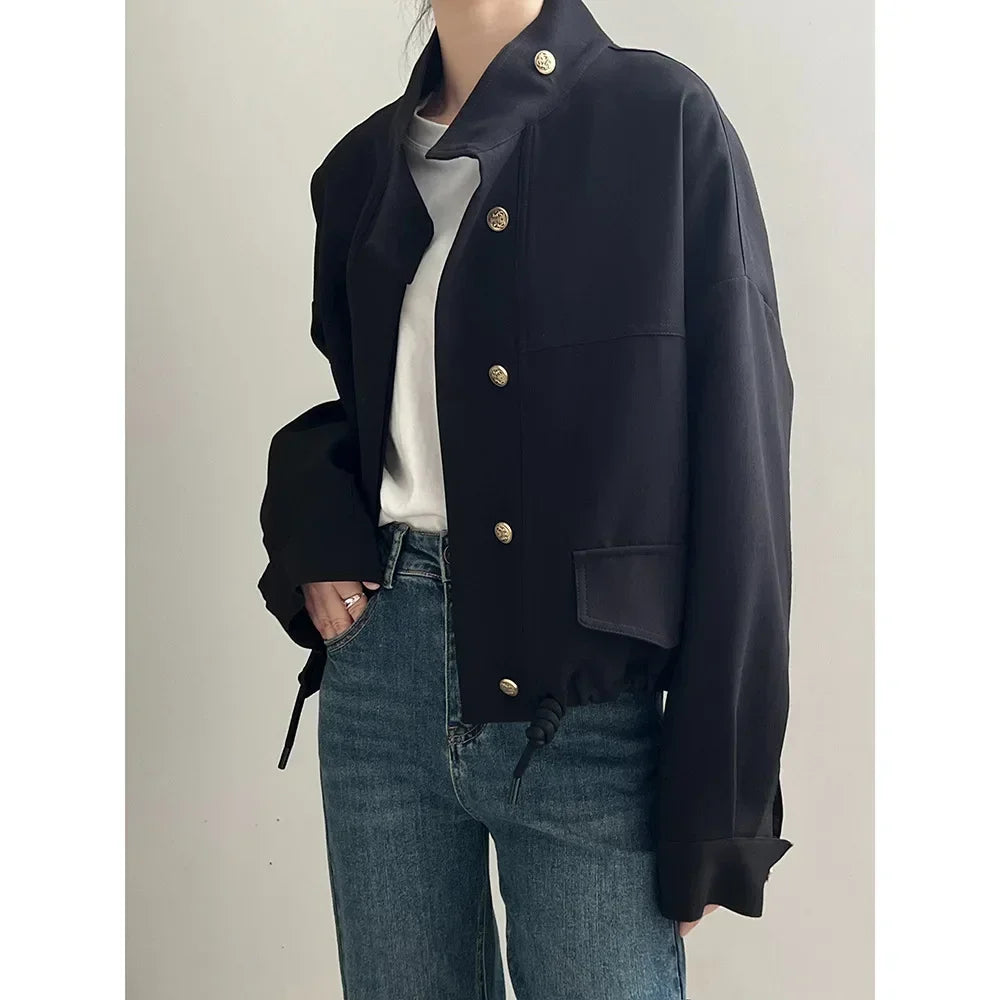 Women Jackets Drawstring Elegant Coat Stand Collar Cardigan Splice Loose Lace Up Single Breasted Coats Autumn Winter Jackets